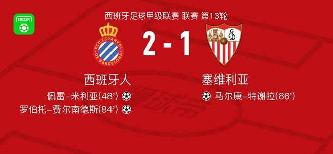 西班牙人2-1塞维利亚,罗伯托-费尔南德斯、佩雷-米利亚破门